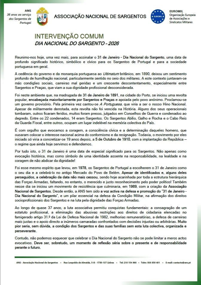 DIA NACIONAL DO SARGENTO - LEIRIA-MONTE REAL Atendendo às consequências deixadas pela depressão Kristin na região de Leiria, o evento comemorativo previsto para Leiria / Monte Real foi CANCELADO. A ANS manifesta-se solidária com as populações afectadas e endereça um...