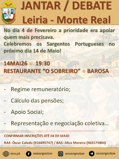 ⚠ Lisboa, na nossa Sede! 🗓 20MAI2025; 🕕 18:00. 🤝 Unidos, pelos Sargentos de Portugal!