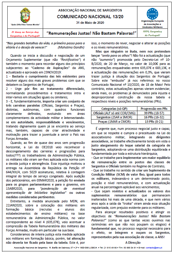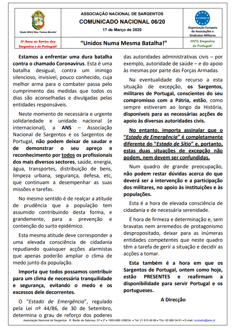 Comunicado conjunto As direções das APM (Associações Profissionais de Militares), reuniram no dia 4 de março de 2020, para fazer a análise à situação socioprofissional dos militares e para dar continuidade às decisões aprovadas e sufragadas na Reunião de Militares do...